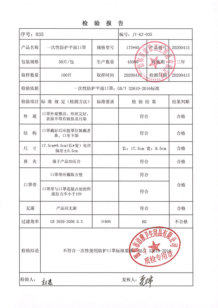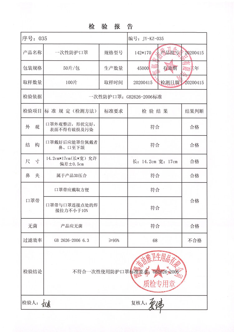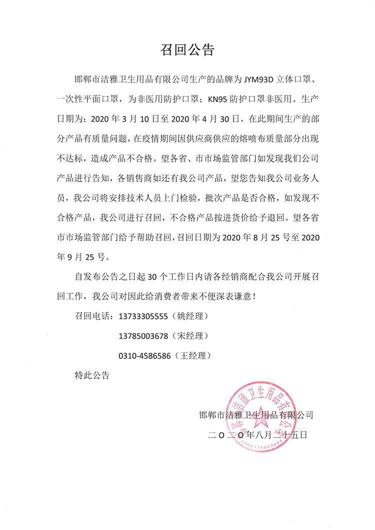 邯鄲市潔雅衛(wèi)生用品有限公司生產(chǎn)的品牌為JYM93D立體口罩一次性平面口罩,為非醫(yī)用防護口罩;KN95 防護口罩非醫(yī)用。生產(chǎn)日期為:2020年3月10日至2020年4月30日,在此期間生產(chǎn)的部分產(chǎn)品有質(zhì)量問題,在疫情期間因供應商供應的熔噴布質(zhì)量部分出現(xiàn)不達標,造成產(chǎn)品不合格。望各省、市市場監(jiān)管部門如發(fā)現(xiàn)我們公司產(chǎn)品進行告知,各銷售商如還有我公司產(chǎn)品,望您告知我公司業(yè)務(wù)人員,我公司將安排技術(shù)人員上門檢驗,批次產(chǎn)品是否合格,如發(fā)現(xiàn)不合格產(chǎn)品,我公司進行召回,不合格產(chǎn)品按進貨價給予退回。望各省市市場監(jiān)管部門給予幫助召回召回日期為2020年8月25號至2020年9月25號